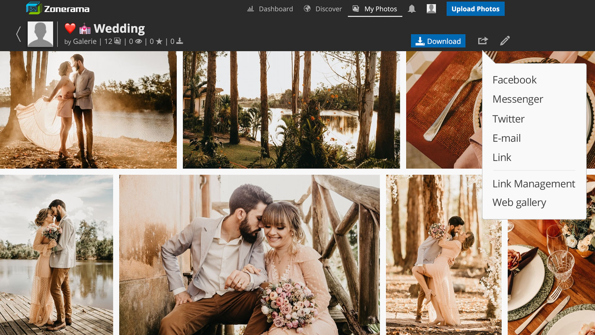 Share your albums, photos, or videos directly on social media. Or create links, give them expiration dates, and send them however you want—for example by email.